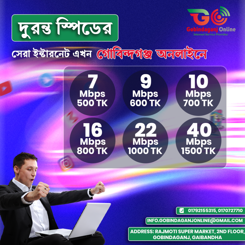 If you’re in Gobindaganj and looking for a reliable and high-performing internet service provider, Gobindaganj Online should be your top choice. With its unwavering commitment to quality, comprehensive services, and customer satisfaction, you can trust that you’re making the right decision. Experience the difference today with Gobindaganj Online—where your internet connection is our priority.